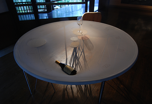 物(モノ)、者(モノ)、霊(モノ)を貫通するモノという言葉をテーマに占星術研究家の鏡リュウジ氏とコラボレーションした作品。ホロスコープテーブル。