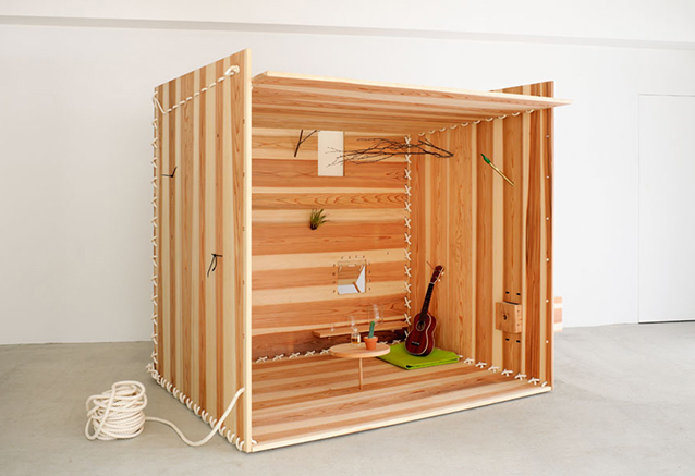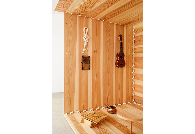 低温乾燥させることで杉本来の豊かな精油分を保った尾鷲の無節杉を使った小部屋。マンションであってもこれを置くことで五面を杉材に囲まれて過ごすことができる小さな居室。