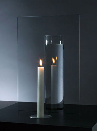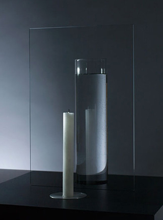 板ガラスの上で手前のキャンドルと背後の水が融合する。火は、知性の象徴であり、この世の象徴である。水は潜在意識の象徴であり、あの世の象徴である。この世とあの世が融合するイメージを感じさせるキャンドルたて。