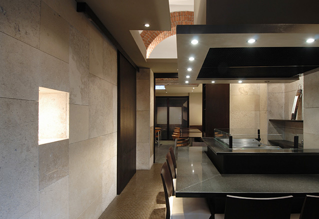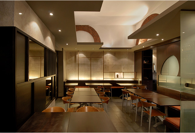 もとバールであった空間を、日本食レストランに改装したもの。既存の石の柱やレンガの壁、アーチ、床などをそのまま残すことが条件であった。それらを利用し、レンガの下端2m70cmの高さに石膏ボードで「ひさし」を設けた。下部を日本食にあう落ち着いた空間とし、上部をレンガの西洋的な空間とし、それらの対照的な性質のものが「ひさし」によって作られた境界面で出会うように意図した。2006年の改装で、床にタイルを貼り、壁にトラバーチンを貼り、トイレを改修し、鉄板焼の設備を設けた。