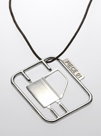 PIECE01と書かれた、自動車のプラモデルの部品のようなペンダントは、溶かして成形するというありかたそのものを装飾にしたものである。