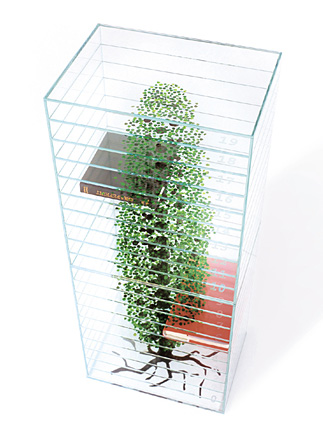 一枚一枚のガラスにポプラの断面パターンがエッチングで描かれている。真横から見るとほとんど何もないが、見下ろした時に樹木の姿が浮かび上がる。 樹木の幻影の中にそれを原料とする本が浮かび上がるような本棚である。
