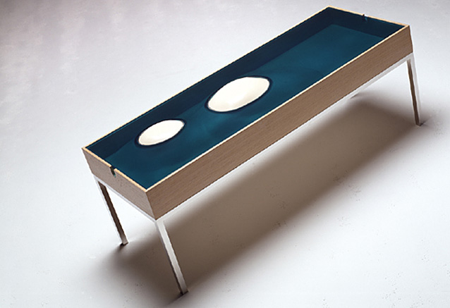 テーブルは海に似ています。船便のことをサーフェス便というように、海面は海中と海上のインターフェースです。天板の上と下は海面と海底のアナロジーとなります。海底は意識されにくい空間ですが、ガラスにあけられた穴を貫通する島が海面と海底をつないでいることが、透明のブルーグリーンのガラス越しにうっすらと見えます。そこにおかれたジュエリーは海底に沈む宝物です。